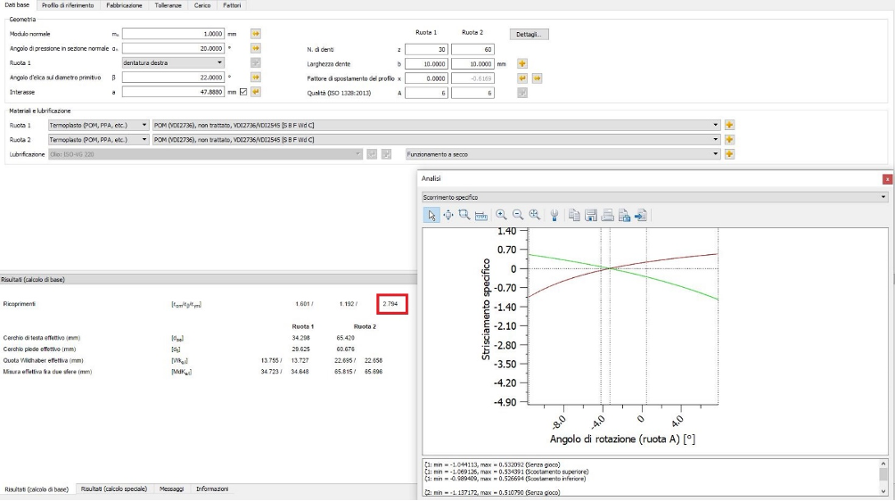 La combinación de los datos derivados del diseño con VDI2736 con los de nuestras pruebas internas nos ha permitido estimar la vida útil de cada tipo de engranaje y dar una respuesta segura sobre la viabilidad de la aplicación. A través del software KissSoft conseguimos optimizar el dentado de los engranajes de tecnopolímero con correcciones y medidas destinadas a aumentar el recubrimiento, la resistencia al desgaste y al pie del diente. Un valor añadido único de nuestros productos que realmente puede marcar la diferencia para todos los profesionales que desean utilizar engranajes de plástico en su trabajo.